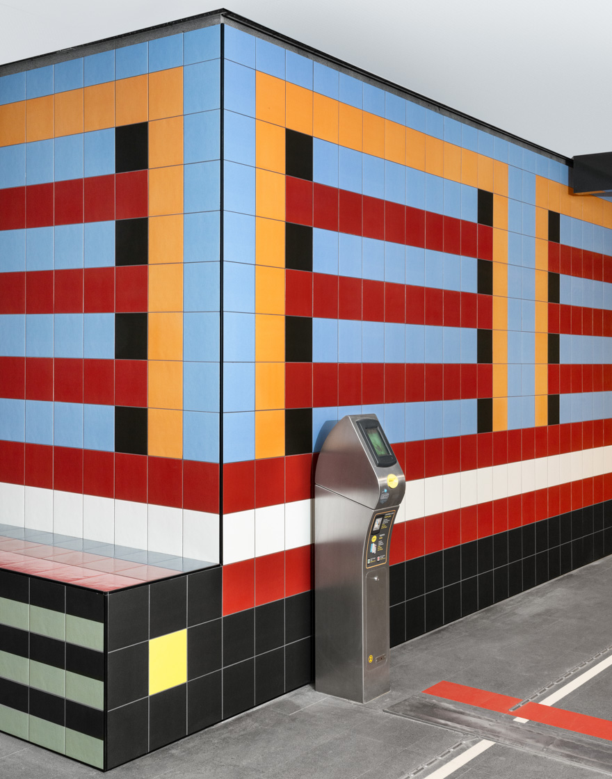 Mind the Gap redefines the fruition of the space through original compositions of shapes and colours, obtained by using the ceramic elements of the collection. The installation invites all the passengers who encounter it in their everyday life to change perspective and be open to new levels of experience, transforming the entrance of the subway into an “other” space that fluctuates between figuration and abstraction.